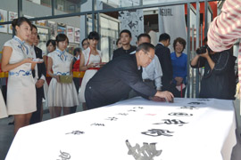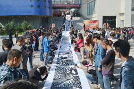 艺术设计系师生们向学院捐赠《我的校园,我的梦》百米长卷,向科技节献上一份厚礼。该画卷是100名学生在老师的指导下,利用课余时间在教学楼长廊展开画布,三人一组,反复构思,精细绘画各自的梦想,经过一个星期的努力完成了修改稿和色彩稿。画卷长达108米,绘画包含了家园梦、娃娃梦、牧歌梦、湿地梦、鱼之梦等33个微主题,有机地形成了一个我的大学校园生活,展示多彩青春,共圆中国梦的大主题。学院领导在捐赠仪式上为画卷盖章签名。