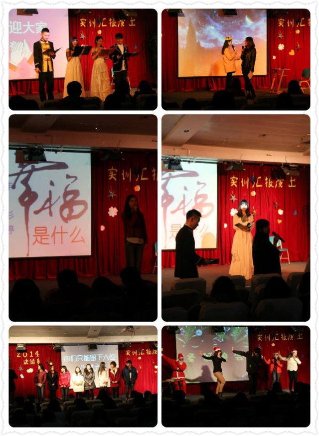214年12月22日,法语系师生欢聚在四百人报告厅,就法语系大二为期一周的实训进行汇报和演出。