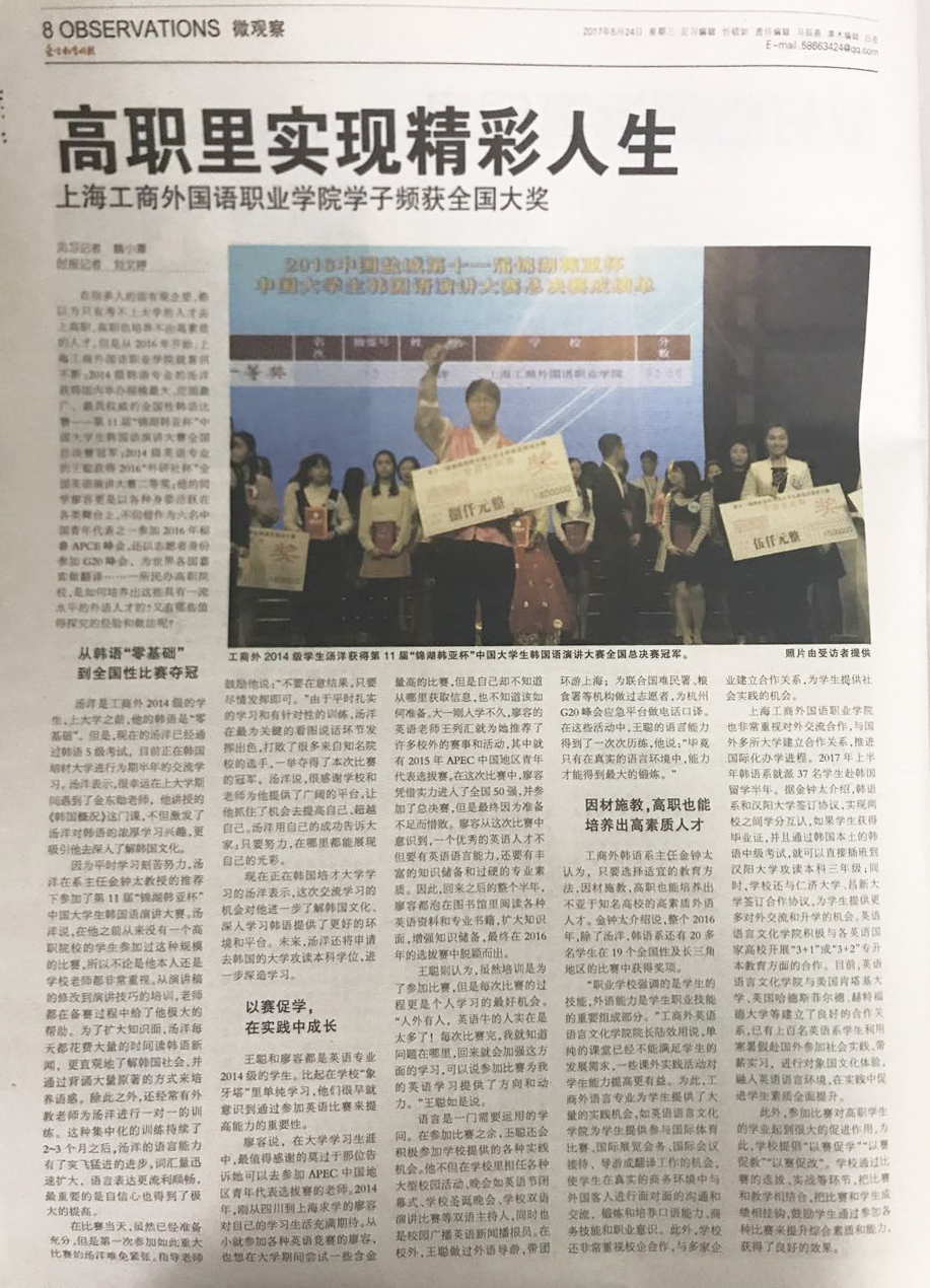 在很多人的固有观念里,都以为只有考不上大学的人才去上高职,高职也培养不出高素质的人才。但是从2016年开始,上海工商外国语职业学院就喜讯不断:2014级韩语专业的汤洋获得国内举办规模最大、范围最广、最具权威的全国性韩语比赛——第11届“锦湖韩亚杯”中国大学生韩国语演讲大赛全国总决赛冠军;2014级英语专业的王聪获得2016“外研社杯”全国英语演讲大赛二等奖;他的同学廖容更是以各种身姿活跃在各类舞台上,不但曾作为六名中国青年代表之一参加2016年秘鲁APCE峰会,还以志愿者身份参加G20峰会,为世界各国嘉宾做翻译……一所民办高职院校,是如何培养出这些具有一流水平的外语人才的?又有哪些值得探究的经验和做法呢?