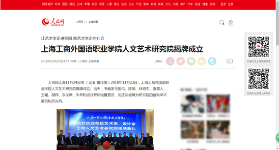 人民网上海11月24日电 (记者 曹玲娟)2018年11月22日,上海工商外国语职业学院人文艺术研究院揭牌成立。当天,书画家毛国伦、陈明、林明杰、張渭人、王曦、胡炜、李戈晔、朱希和设计界新锐鲁普及、刘正法被聘为研究院的首批学术委员和研究员。