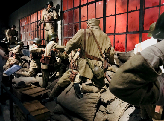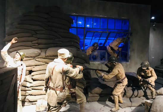 随后,跟随讲解员的话语,大家如穿越时空隧道,回到了1937年那个炎热而难忘的夏季,同志们了解到明明只有400余人的一个营,为何对外宣称有“八百壮士”,为何法租界要将谢晋元将军及幸存战士们扣留在胶州路孤军营长达4年之久,为何抗战勇士却被押送海外,直到垂老才能返回祖国。一幅幅历史照片,一件件烈士遗物,一个个杀敌场景,一段段影像资料,生动真实地展现了淞沪抗战的历史全貌以及抗日将士反抗日军侵略的壮烈情景。最让人震撼一幕场景,是我们的一名战士身上绑满了手榴弹,毅然从高处跳下,落入日军的包围中,与敌军同归于尽。每一幕复原的模拟场景,大家都驻足观看,虽默默无语,内心却早已激动万分。
