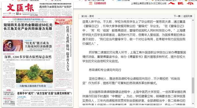 《文汇报》2019-11-25 第一版报道沪上高校结合第二批主题教育,扎实推进思政课改革创新,打造“大思政”格局 提升育人合力。我校“打造傅雷校园文化,探讨思政育人新路”主题教育创新案例入选。