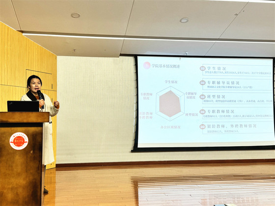 孟晶副院长对党务、学生、招生就业以及综合行政工作进行全面总结,概述了本学期学生工作的整体框架和主要目标。她强调,党建工作是学院发展的根本保证,过去一年中,学院党组织发挥了战斗堡垒作用,引领学院各项工作高效有序发展。在学生工作方面,她强调团结协作的重要性,通过加强辅导员队伍建设来强化团队沟通,促进协作、提高工作质效,同时倡导全体辅导员和专业教师保持良好的双向沟通,推动实习就业工作的顺利开展。