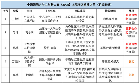 近日,上海市教育委员会公布了中国国际大学生创新大赛(2025)(上海赛区)获奖名单。上海工商外国语职业学院与上海思博职业技术学院学子在市赛职教赛道中携手发力,共斩获25个奖项。其中上海工商外国语职业学院收获“匠新合作奖”1项、银奖1项、铜奖6项,获奖名次和数量创历史新高;上海思博职业技术学院不仅斩获“匠新合作奖”2项、银奖1项、铜奖14项,同时学校还获得市赛“优秀组织奖”荣誉。