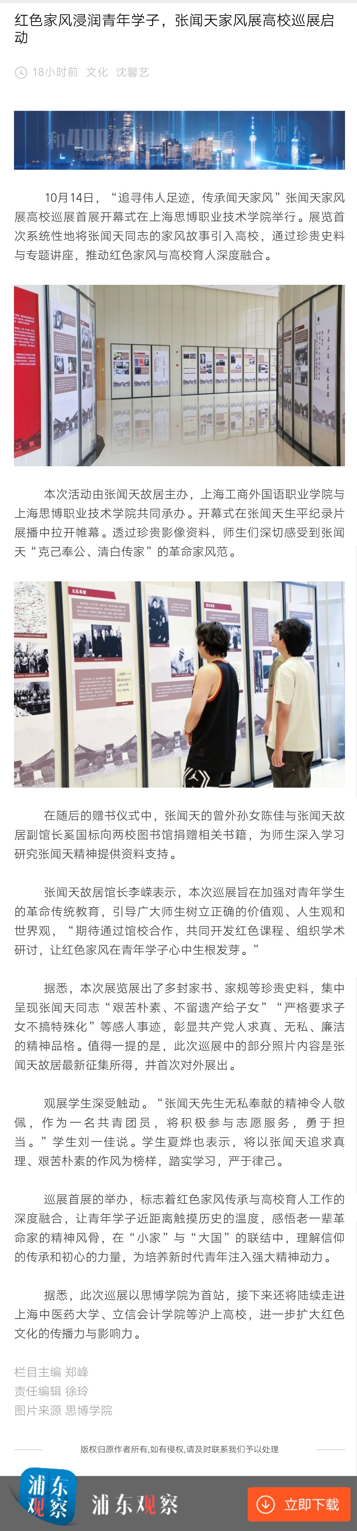 10月14日,“追寻伟人足迹,传承闻天家风”张闻天家风展高校巡展首展开幕式在上海思博职业技术学院举行。展览首次系统性地将张闻天同志的家风故事引入高校,通过珍贵史料与专题讲座,推动红色家风与高校育人深度融合。