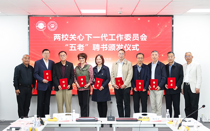 在热烈的掌声中,关工委“五老”聘任证书发放仪式举行。副校长张学龙宣读聘任决定,工商外校长姚秀平与思博校长黄正共同为“五老”代表颁发聘书。仪式结束后,全体与会人员合影留念。此外,在交流发言环节,护理学院马志华老师与正在支教的曾军老师还通过短视频向大家表达了节日祝福,并分享教育心得。
