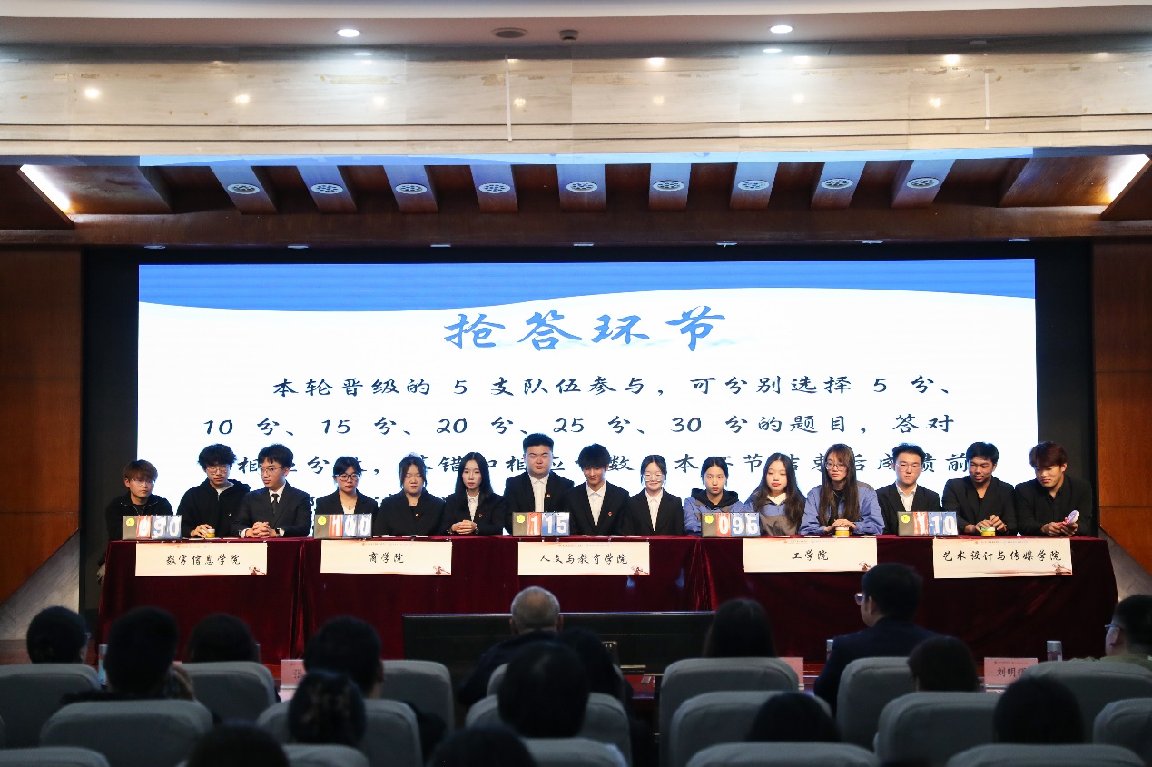 决赛抢答环节将现场氛围推向高潮。五支队伍全神贯注、严阵以待,抢答器声音此起彼伏,每一次抢答都凝聚着团队的智慧与默契。选手们反应敏捷、逻辑清晰,或稳扎稳打,或果断出击,比分交替上升,悬念迭起,现场掌声与惊叹声不断。最终,商学院、人文与教育学院、数字信息学院三支队伍凭借扎实功底与出色发挥,成功挺进法治宣讲环节,赢得全场喝彩。