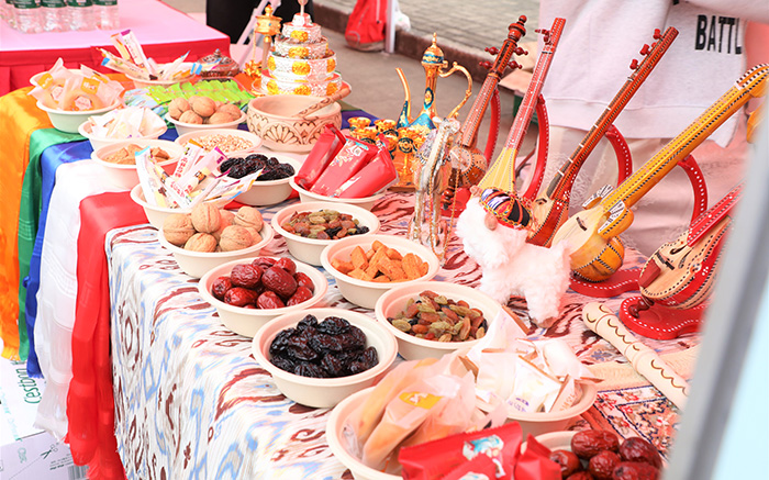 本次民族文化展示活动涵盖民族文艺表演、民族特色文化展示、民族游戏互动体验及海派文化展区等内容。在主舞台展演区域,我校商学院潘琦涵同学身着独特绚丽的维吾尔族传统服饰表演独舞节目《美丽的阿依汗》,她以优美热情的舞姿、搭配悠扬欢快的音乐,生动展现了我校学子自信昂扬的精神风貌。在民族特色文化展示区,我校通过主题展板呈现学校民族工作的成效与特色亮点。同时,同学们精心准备了富有藏族、维吾尔族特色的传统手工艺品及民族特色美食,吸引了众多师生驻足并参与体验,在互动中增进了对不同民族文化的了解与认同。