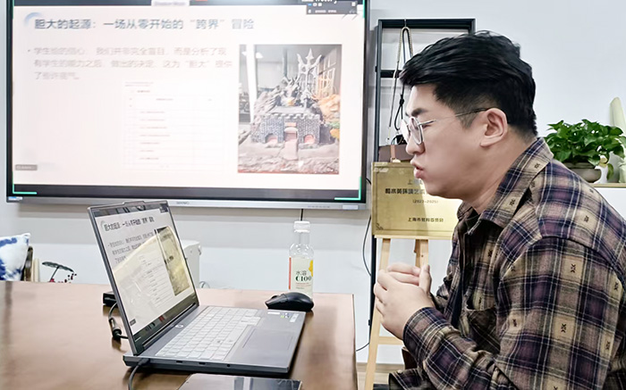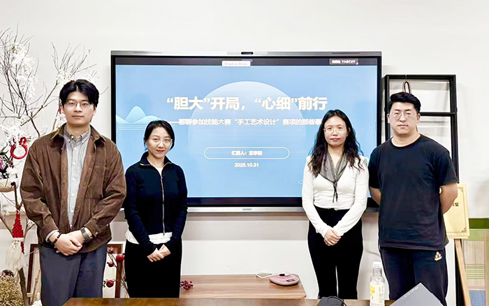 作为工作室校内骨干教师,王李喆老师拥有丰富的实践教学与赛事指导经验。他紧扣“手工艺术设计”赛项,从创意构思、技艺打磨、材料运用到心态调整,系统分享备赛实战心得。他提出的“成功作品需‘胆大’与‘心细’辩证统一”这一核心观点,引发在场师生强烈共鸣:“胆大”即突破常规,在主题、材料、表现形式上敢于创新,赋予作品独特的艺术灵魂;“心细”则体现在对工艺细节的把控、对作品完整性的追求以及对文化内涵与情感的细腻表达。他强调,手工艺术是创作者思想文化的载体,唯有将创意表达与工匠精神深度融合,方能在激烈竞争中脱颖而出。