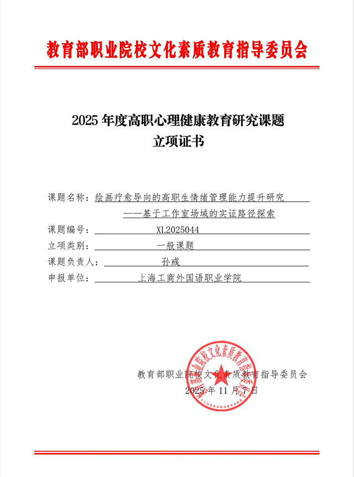 艺术设计(少儿美术)专业教师孙彧博士主持的“2025年度高职心理健康教育研究课题”成功获批教育部职业院校文化素质教育指导委员会立项。该课题聚焦高职学生心理健康教育重点难点,贴合职业教育文化育人导向,兼具理论价值与实践意义。此次科研立项的成功,是学院科研实力与育人理念的双重体现,不仅为高职院校心理健康教育改革提供了有益参考,也标志着学院在特色学科方向上的研究水平获得专业认可,为后续科研成果转化、服务区域文化产业发展提供有力支撑。