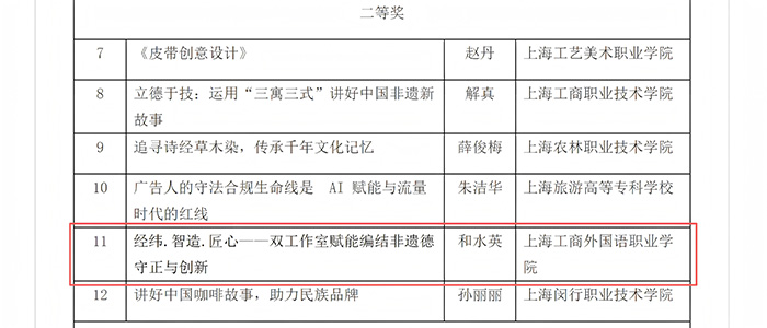 环境艺术设计专业和水英教授主持的《经纬・智造・匠心——双工作室赋能编结非遗的守正与创新》案例在上海高职高专首届课程思政优秀(经典)案例遴选中荣获上海高职高专首届优秀案例二等奖。本次评选由上海高职高专思想政治理论课建设联盟等三大单位联合组织,旨在推进职业教育课程思政内涵式发展。和水英教授的案例聚焦传统编结非遗传承困境,积极响应国家非遗活态传承与产教融合政策导向,首创“禾风织造+营匠数字建模”双工作室模式,形成“双轨贯通、五域联动、分层进阶”教学体系。案例以“经纬・智造・匠心”为思政主线,融入二十四节气文化内涵,通过数字建模与手工实践的闭环训练,有效破解非遗传承与专业、思政教育融合难题。此次获奖是我校在课程思政建设方面的重要突破,彰显了学校在非遗传承与专业教育融合领域的探索成效。