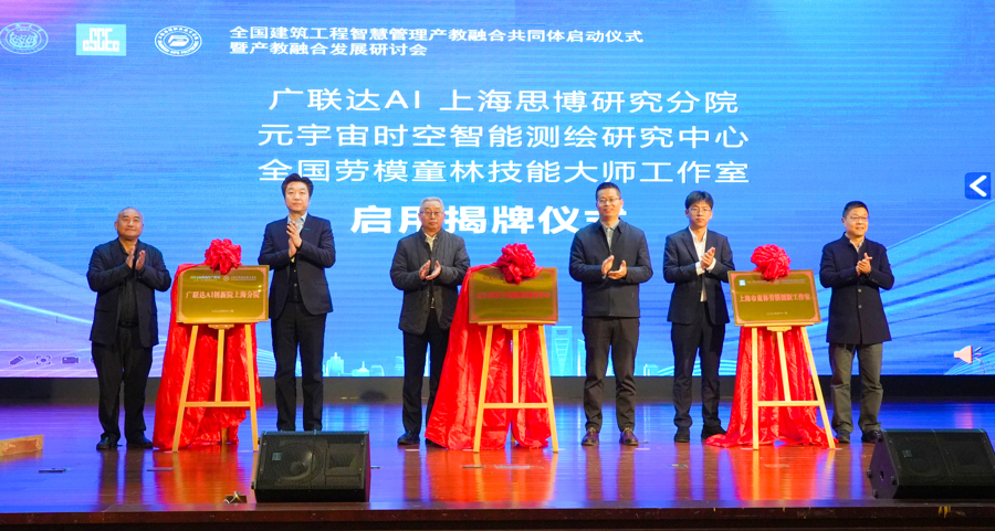 现场同步举行产教融合平台揭牌仪式。广联达AI上海思博研究分院、元宇宙时空智能测绘研究中心、全国劳模童林技能大师工作室启用,三大平台将聚焦技术研发与人才培养核心需求,为共同体开展实践教学、攻克行业难题提供支撑。