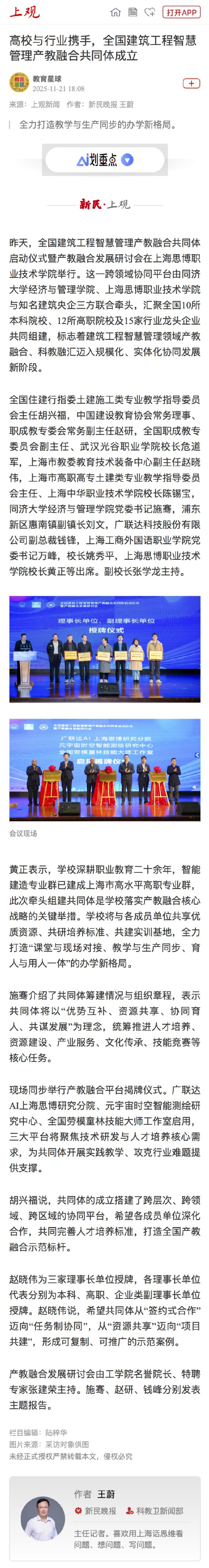 昨天,全国建筑工程智慧管理产教融合共同体启动仪式暨产教融合发展研讨会在上海思博职业技术学院举行。这一跨领域协同平台由同济大学经济与管理学院、上海思博职业技术学院与知名建筑央企三方联合牵头,汇聚全国10所本科院校、12所高职院校及15家行业龙头企业共同组建,标志着建筑工程智慧管理领域产教融合、科教融汇迈入规模化、实体化协同发展新阶段。