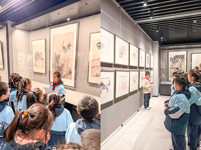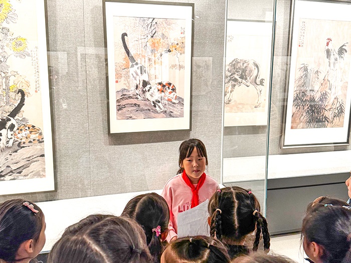 在《十二生肖图》展区,解说员支子穆手持自制生肖卡片与画作巧妙对照讲解:“徐爷爷笔下的小动物多可爱呀!机灵的小老鼠、憨厚的老黄牛……简单线条就让它们活灵活现,这正是中国画的独特魅力!”孩子们兴奋地寻找自己的属相。欢声笑语中,艺术的种子悄然萌芽。