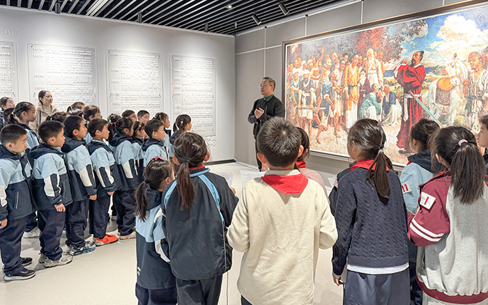 从《九州无事乐耕耘》的田园祥和,到《九方皋》的慧眼识才,再到《会师东京》的胜利期许,每一幅名作都在小解说员的生动讲述中焕发新生。艺术技巧与爱国情怀在笔墨间交融,深深打动了现场每一位观众。