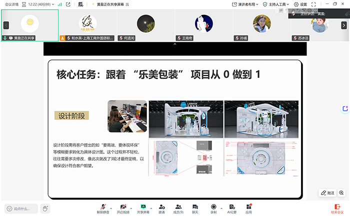 针对传统会展设计教学中“设计与施工脱节、实操能力薄弱、新媒体技术应用难”等核心痛点,黄盈老师以“乐美包装”特装展台项目为切入点,全程参与企业实践:从前期客户对接、方案设计,到中期施工落地,再到后期验收归档,完整经历会展项目全流程。期间,她学习客户、搭建商、材料商三方协调沟通技巧,积累成本控制、施工应急调整等工作经验,还跨界探索新媒体直播技术在展示空间的应用逻辑,为教学革新储备“接地气”的实践素材。
