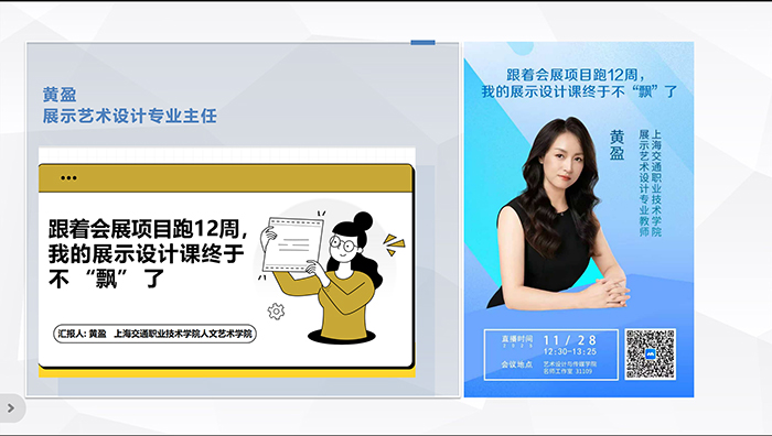 11月28日中午,环境艺术设计名师工作室第七期公开课在艺术设计与传媒学院相关工作室举行。本次活动采用线上会议形式展开,由名师工作室负责人和水英教授主持,上海交通职业技术学院黄盈老师担任主讲。黄盈老师以“跟着会展项目跑12周,我的展示设计课终于不‘飘’了”为主题,分享了自己作为展示设计教学一线教师、赴上海世福展览服务有限公司参与12周会展的工作经历,并将真实项目经验融入课程教学,为环境艺术设计专业教学改革提供了现实样本。市级学员上海闵行职业技术学院苏冰洁、上海工商职业技术学院付丽丽,及我校郑舒文、王玉等校级学员参加活动。