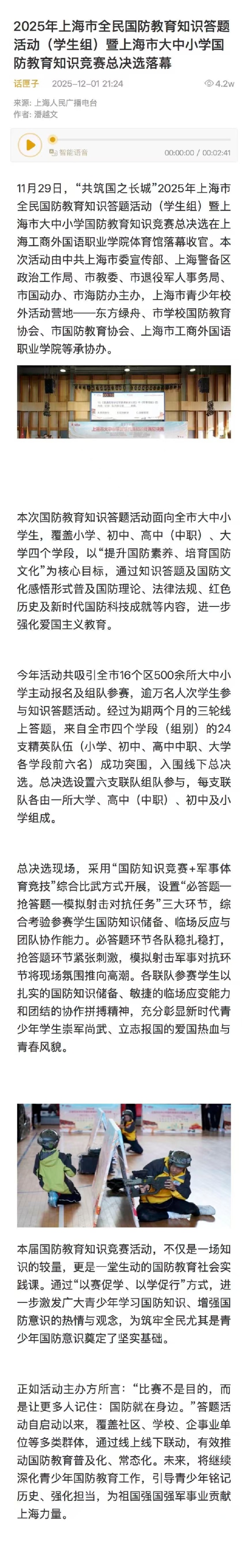 正如活动主办方所言:“比赛不是目的,而是让更多人记住:国防就在身边。”答题活动自启动以来,覆盖社区、学校、企事业单位等多类群体,通过线上线下联动,有效推动国防教育普及化、常态化。未来,将继续深化青少年国防教育工作,引导青少年铭记历史、强化担当,为祖国强国强军事业贡献上海力量。