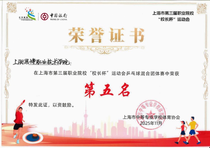 11月23日,上海市第三届职业院校“校长杯”运动会乒乓球男女混合团体赛在上海闵行职业技术学院落幕。校领导黄正带队参赛,代表队以“六战四胜”的战绩斩获团体第五名,校领导黄正获“优秀运动员”称号。