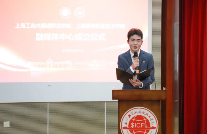 融聚新力量,赋能新发展。12月11日下午,上海工商外国语职业学院与上海思博职业技术学院融媒体中心成立仪式在工商外八号楼二楼报告厅举行。上海工商外国语职业学院党委书记万峰,上海思博职业技术学院党委副书记、副校长张辉,上海教育报刊总社《新读写》杂志社编辑部主任、《东方教育时报》记者魏小潭,上海教育报刊总社学生媒体发展中心事业部副主任顾力丹,国家一级摄影师、中国摄影家协会会员、学校特聘专家卢卫平,学校新闻采编与制作专业主任陈小萍,以及教师宣传员、融媒体中心学生成员共同参会,见证这一重要时刻。活动由张耀文同学主持。