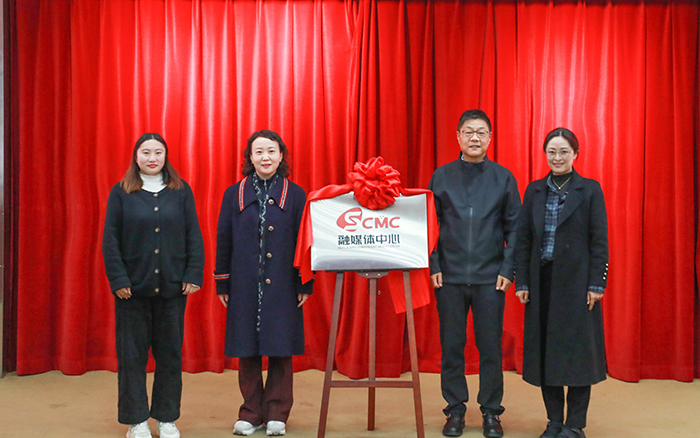 在仪式核心环节,学校党委书记万峰,党委副书记、副校长张辉,党委宣传部部长王秋凤、副部长汪李琴,共同为融媒体中心揭牌。