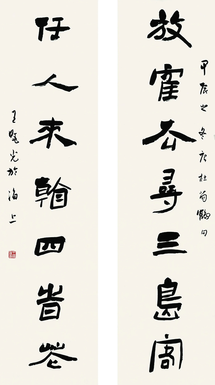我校王晓光老师此次参展作品《放鹤任人七言联》是一幅隶书作品,在汉碑隶书基础上自如发挥笔墨技巧,以点画抒写情怀、表达精神情感,展现了深厚的书法功底与鲜明的个人风格。王晓光教授在致力于书法创作的同时,深耕书法理论研究,成果丰硕。他已出版学术专著七部,其中三部连续获得三届中国书法兰亭奖(系中国书法领域最高奖项)。目前,他主持我校教育部人文社会科学研究课题一项。