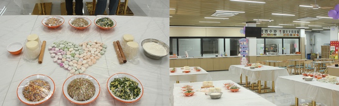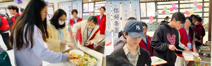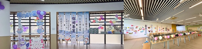 “归家团圆暖,岁月隆冬至”的横幅与冬至文化展板相映成趣,营造出浓厚的节日氛围和家庭般的温暖空间。这样的布置不仅让学生们在参与活动的过程中深入了解冬至文化内涵,更能从环境中感受到家一般的温馨与关怀。