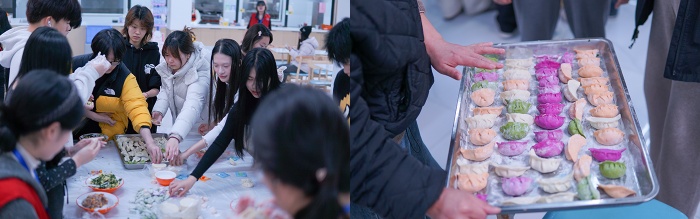 活动中,食堂内欢声笑语、暖意涌动。师生们分工协作、默契配合,擀皮、包馅、捏褶等环节有条不紊。同学们各自展示家乡包饺子技艺,形态各异的饺子承载着不同的故土情怀。