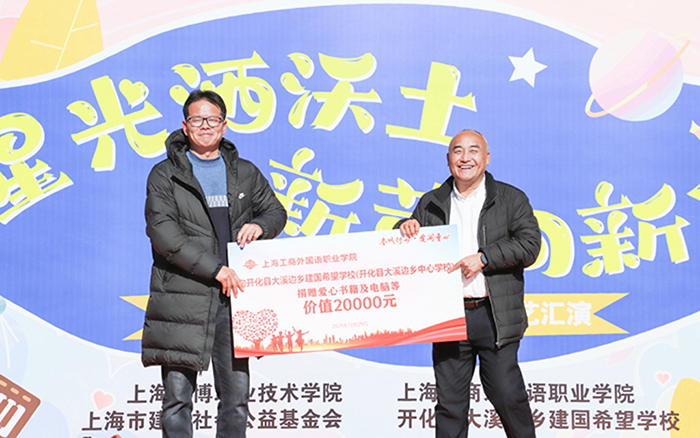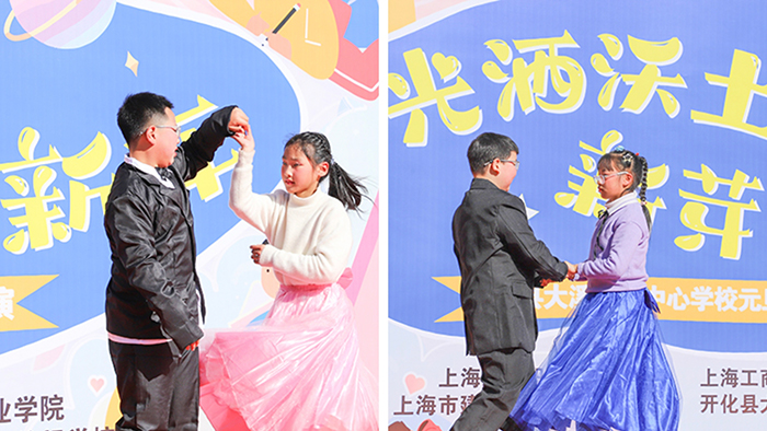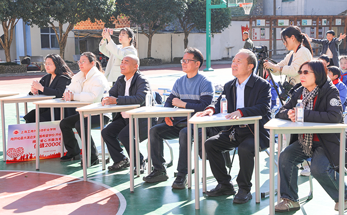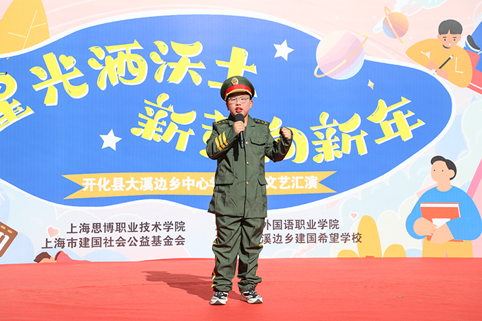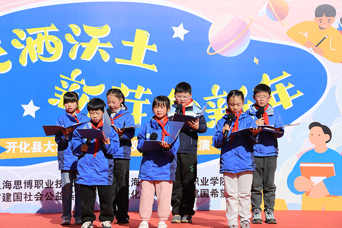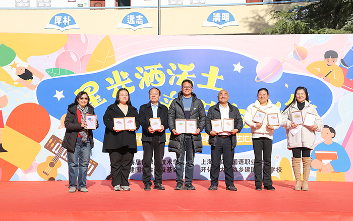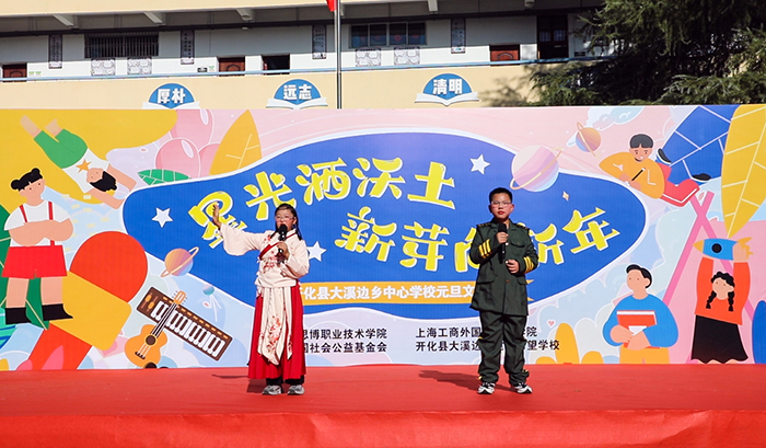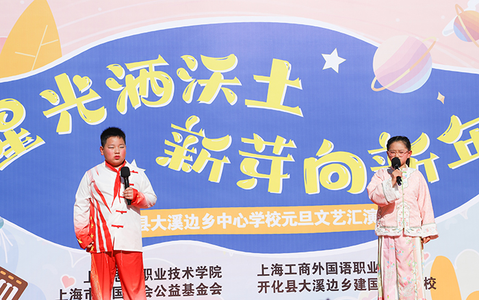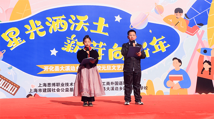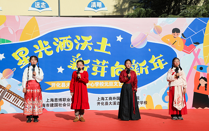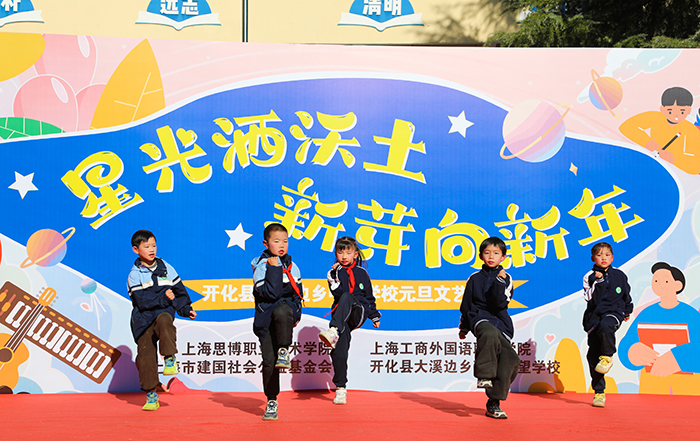 12月29日,新年前夕,上海工商外国语职业学院、上海思博职业技术学院第三批支教小分队奔赴浙江衢州开化县大溪边乡建国希望学校(开化县大溪边乡中心学校),以教育接力传递温暖,用爱心行动迎接新年。校领导黄正带队,人力资源部部长汤丽佳、人文与教育学院院长张金福随行,护送青年海归博士朱陈希老师赴开化支教,并探望慰问坚守岗位的曾军、左月明两位支教老师,以实际行动延续跨区域教育帮扶的温暖约定。当天,开化县大溪边乡中心学校(以下简称“中心学校”)以一场“星光洒沃土 新芽向新年”元旦文艺汇演致谢帮扶情谊,同步举行的捐赠仪式活动,为山区孩子送去新年温暖,助力乡村美育持续发展。