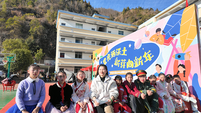 作为中心学校首次隆重举办的元旦文艺汇演,精彩纷呈的节目串联起孩子们的成长与感恩。经过左月明老师的指导,同学们发掘了自身的“隐藏技能”,也学会了如何更加勇敢、自信地登台展现自我。哈尼族童谣《其多列》充满童真童趣,《星光恰恰恰》《小螺号》等合唱曲目旋律明快,《妈妈格桑拉》《乡间的小路》《强军战歌》以及《萱草花》《大鱼》等独唱、合唱饱含深情,华尔兹舞蹈《第二圆舞曲》、创意节目《说唱脸谱》《校园小戏迷》各具特色,歌唱及朗诵《我相信》《我们的青春中国》、舞蹈《向快乐出发》则展现出少年意气,师生共唱的《如愿》更是将现场氛围推向高潮。孩子们用自信的表演、真挚的情感,展现了在支教老师帮扶下的成长蜕变,也让这场跨越480公里的相聚充满温情。