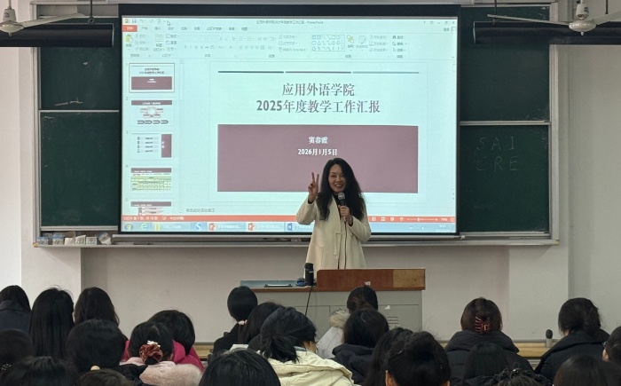 1月5日,应用外语学院2025-2026学年第一学期总结大会在12345阶梯教室召开。学院领导班子及全体教职工参会。会议由副院长孟晶主持。