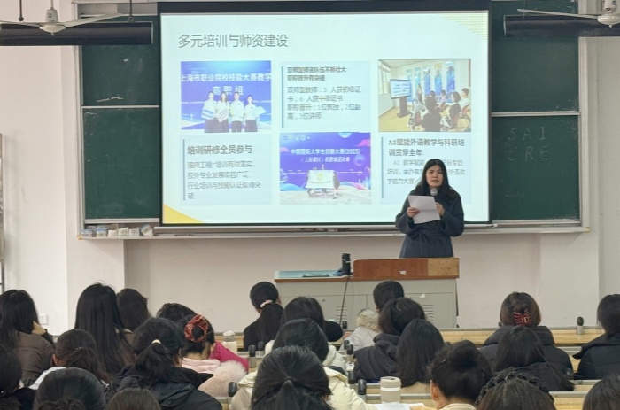 院长助理窦春霞作教学工作总结。她肯定了过去一学年学院全体教职工共同维护的良好教学秩序与教学质量监控成效,同时也指出实训室建设、信息化教学应用等需要进一步强化的地方。针对新学期的工作任务要求,她提出要重点推进“语言+技能”课程建设,启动“AI+外语”教学改革计划,在不断完善教学质量保障体系的基础上,扎实开展微专业、微课程的建设工作。