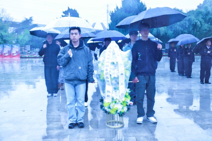 上午9时许,祭扫仪式在庄严的国歌声中正式开始。全体师生在烈士纪念碑前整齐列队、冒雨肃立、齐唱国歌。两名学生代表将承载着深切敬意的花篮缓缓敬献至纪念碑前,挽联上“烈士永垂不朽”庄重醒目,寄托着青年学子对革命先烈的追思与崇敬。全体师生向为解放上海英勇献身的革命烈士默哀,并向烈士纪念碑三鞠躬,以朴素庄重的礼仪致以崇高敬意。
