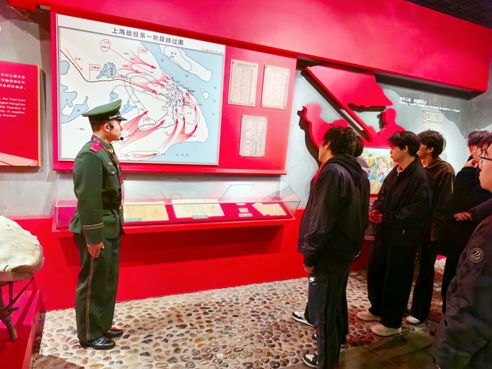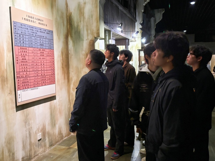 仪式结束后,全体师生走进上海战役浦东纪念馆,开展爱国主义教育活动。纪念馆由序厅、运筹帷幄、进军上海、鏖战浦东、乘胜追击、英烈厅6个部分组成,陈列各类文物、实物和照片380余件。在讲解员引导下,大家认真观看珍贵展品,聆听革命英雄故事。纪念馆采用壁画、雕塑、模型、影景合成等多元技术,通过声、光、电等高科技手段,真实再现了当年上海解放战役中激烈而悲壮的战斗场景,让青年学子如临其境、深受震撼。