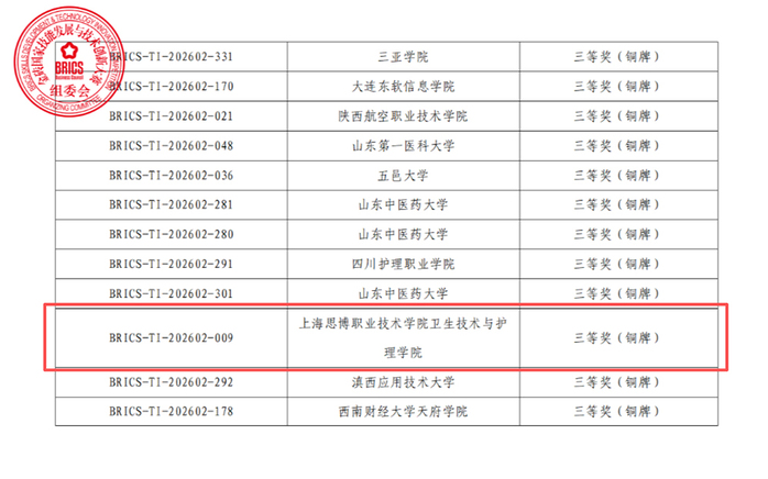 近日,2026一带一路暨金砖国家技能发展与技术创新大赛之技术创新赛国内决赛圆满落幕。学校思博国际护理学院何云玉、成雅婷、陈光三位教师组成的参赛团队沉着应战、表现优异,在数字健康与医疗赛道中荣获全国三等奖。此次获奖既是学院教师团队奋力拼搏的成果,也是学校重视师资培养、坚持以赛促教、以赛促研的有力体现。