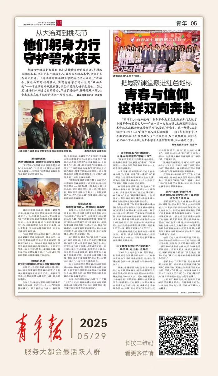 大治河畔的历史长歌里,他们是精神火种的接力者;乡村振兴的沃土上,他们是奋斗的拓荒人;碧水蓝天的画卷中,他们是生态的守护者。上海工商外国语职业学院通过校地协同、产教融合、多元共育的创新模式,实现青春学子与社区的“双向奔赴”——学生用行动赋能社区,社区以实践反哺学生成长。在这里,青年们以躬身力行的姿态,厚植家国情怀、锤炼过硬本领,让青春之光在服务社会的浪潮中熠熠生辉。